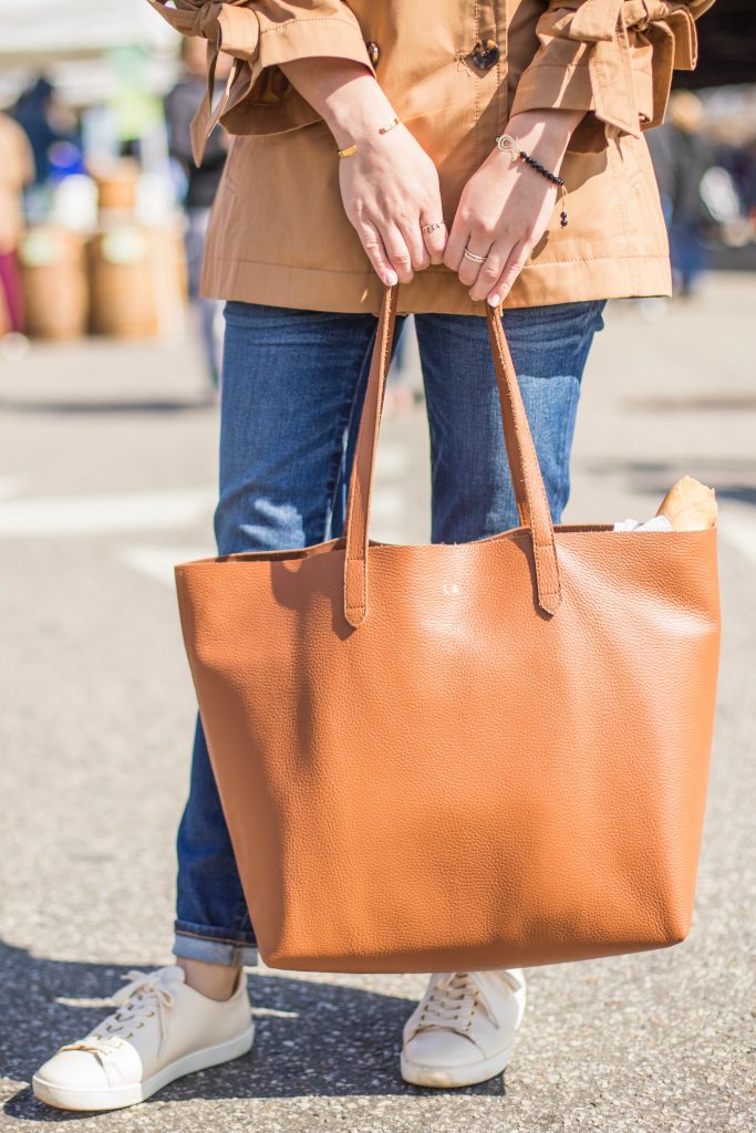 Jacket: Banana Republic | Denim: J. Crew | Sneakers: Sezane | Scarf: Haute Hijab | Tote: Cuyana | Sunglasses: Ray-Ban | Lipstick: Stila Patina