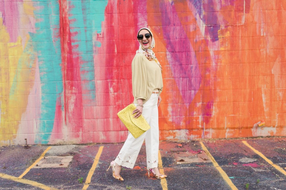 I don’t believe in the silly rule of no white after labor day – white denim can be worn year round! But I do believe that white denim is ESSENTIAL for summer! I have a few different styles of white jeans – skinny, boyfriend, and cropped. A classic pair of white jeans can be styled numerous ways! A few of my favorite ways to style mine are with a colorful bright top and sandals or with a stripe tee and some wedges!