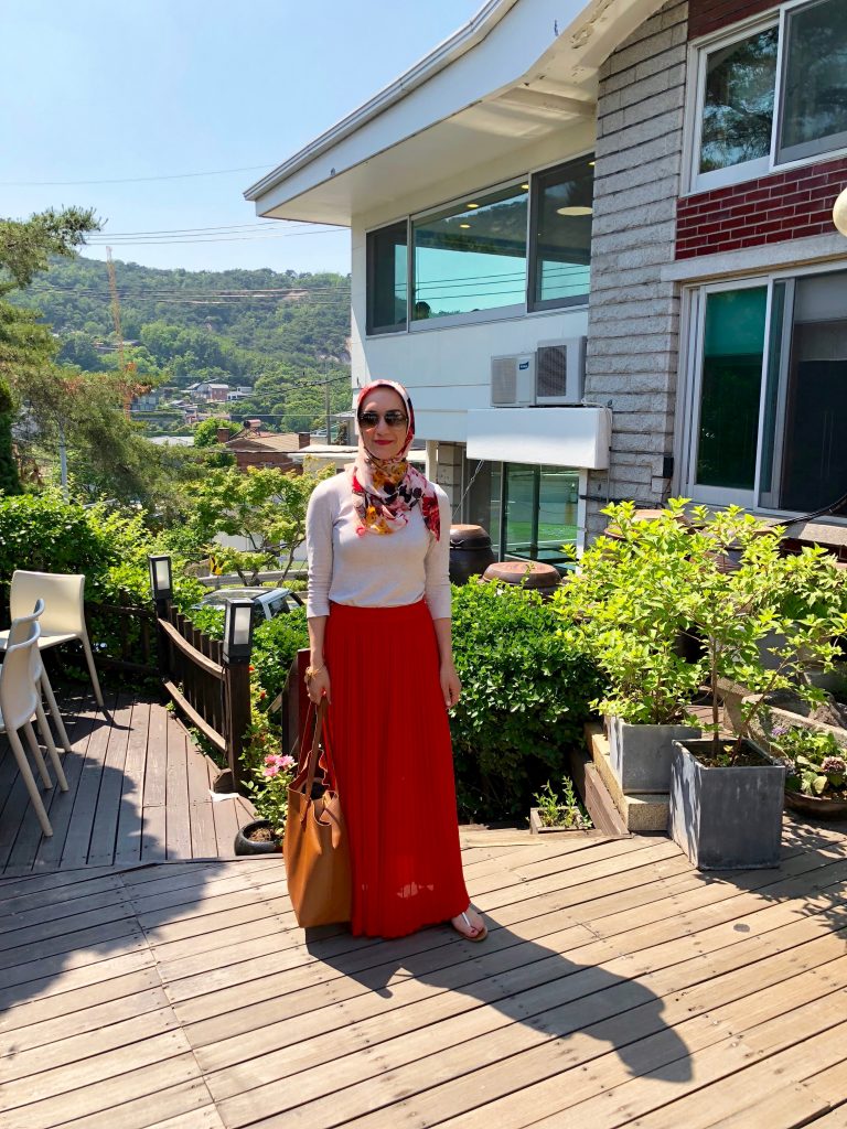 Top: SheIn c/o | Skirt: Banana Republic (old, similar) | Scarf: Haute Hijab | Sandals: M. Gemi | Tote: Cuyana