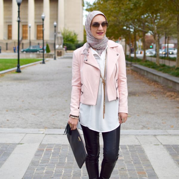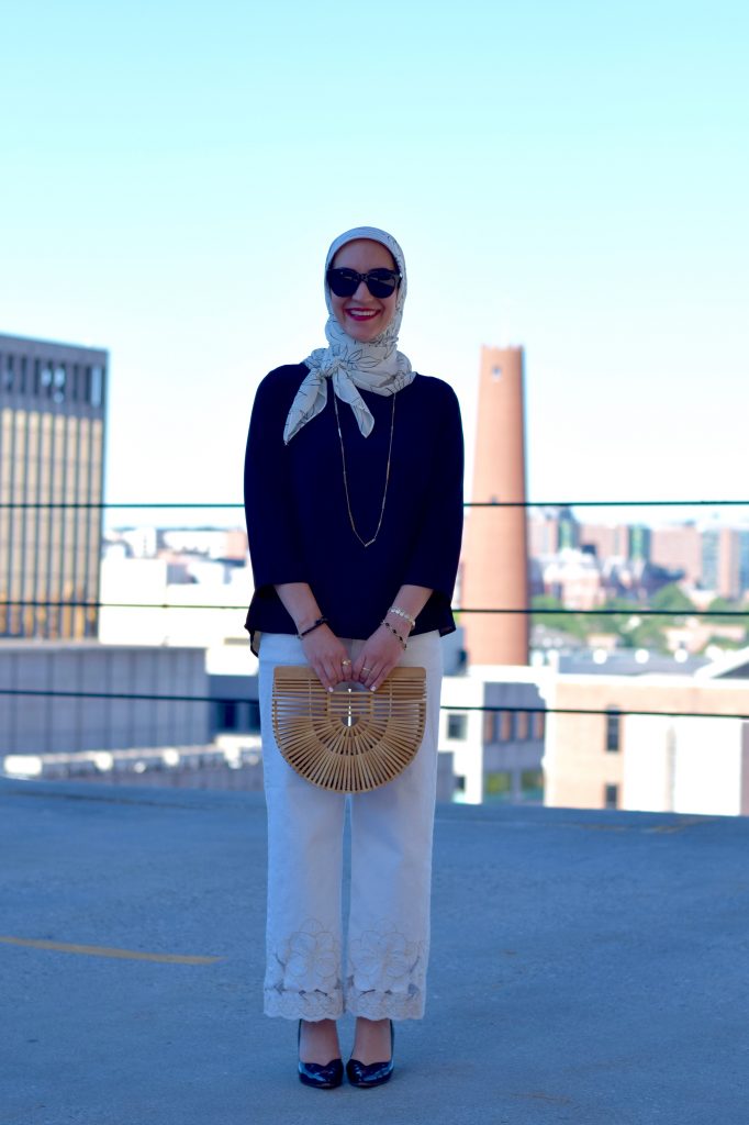 Top: Nordstrom | Denim: Anthropologie (similar) | Scarf: Haute Hijab | Heels: M. Gemi | Bag: Cult Gaia | Bracelets: Kendra Scott & LOFT | Sunnies: Nordstrom
