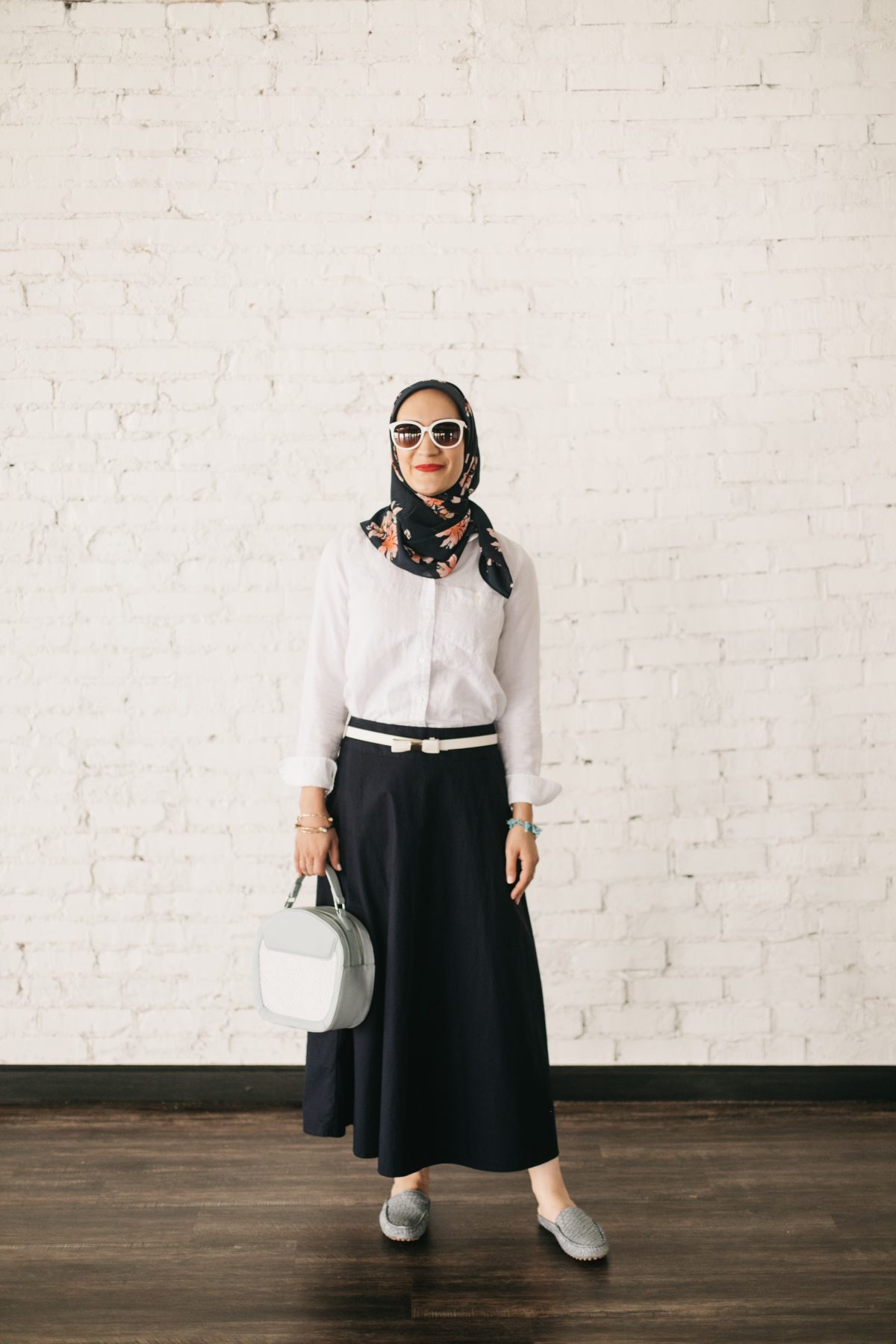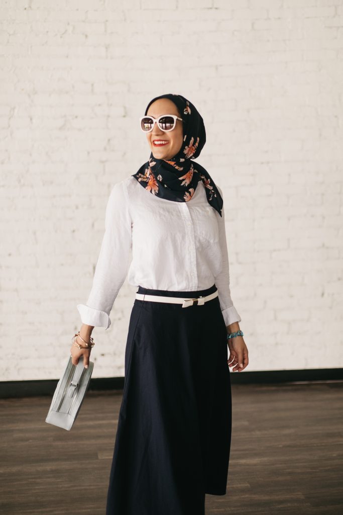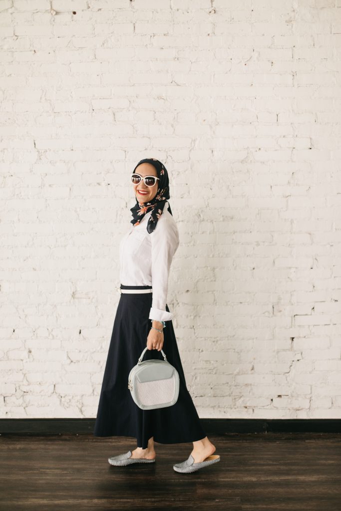 Skirt: LOFT (sold out, similar) | Top: J. Crew | Belt: The Limited (old, similar) | Scarf: Haute Hijab | Mules: M. Gemi | Bag: Urban Expressions c/o | Bracelets: Kendra Scott | Sunnies: Talbots (old, similar) | Lipstick: MAC To Matte With Love