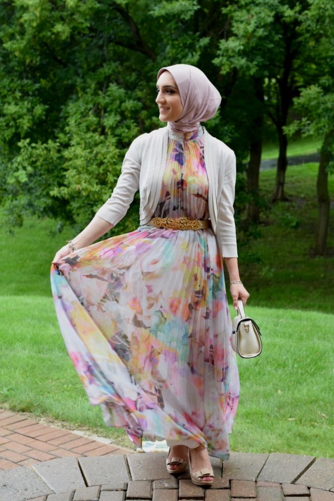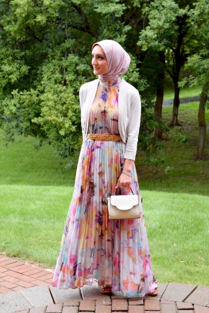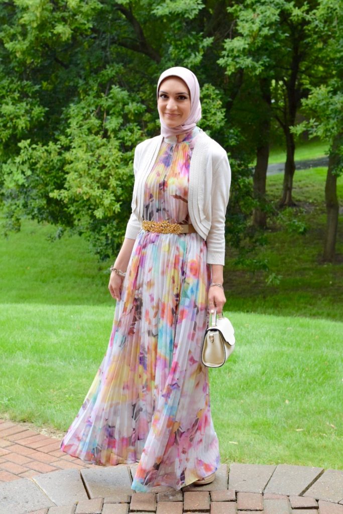 Dress: Ted Baker (old, similar) | Bolero: Nordstrom | Belt: BCBG (old, similar) | Scarf: Haute Hijab | Bag: Urban Expressions c/o | Heels: DSW (old, similar) | Ring: Kendra Scott c/o | Lipstick: MAC Softly Rockin’