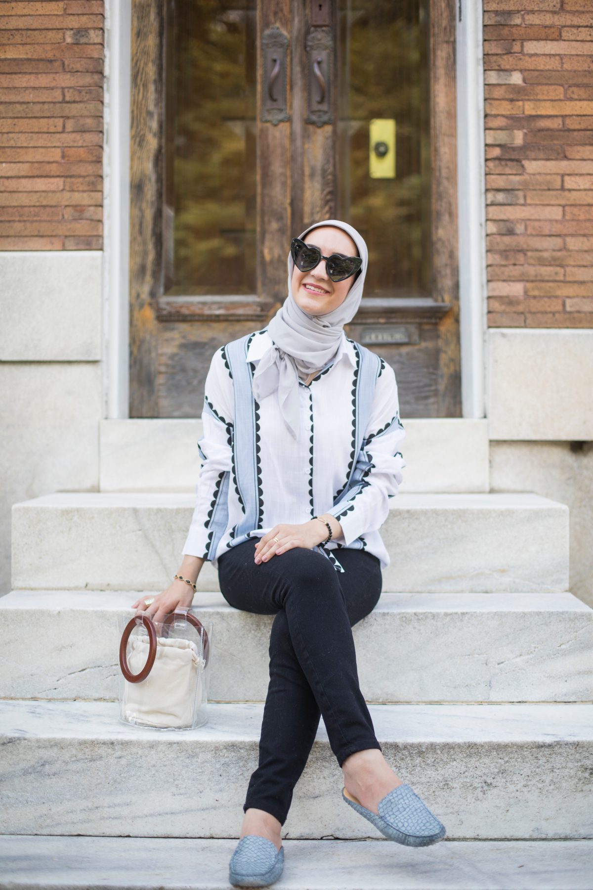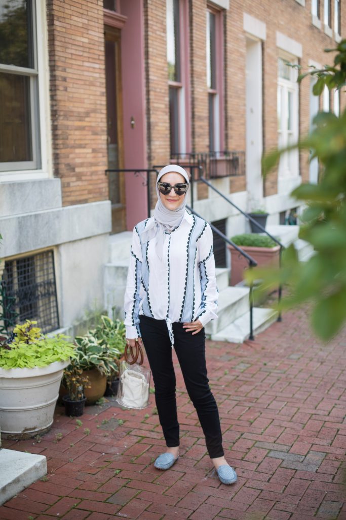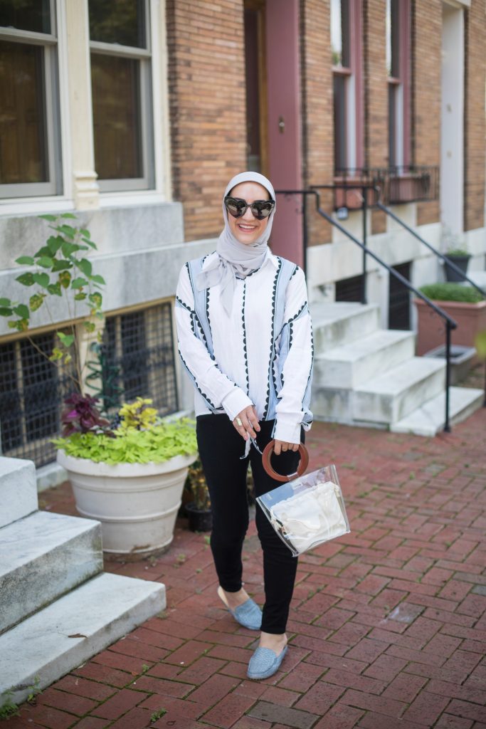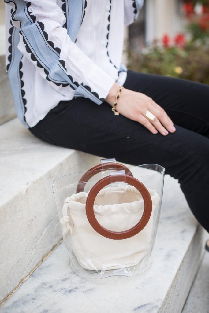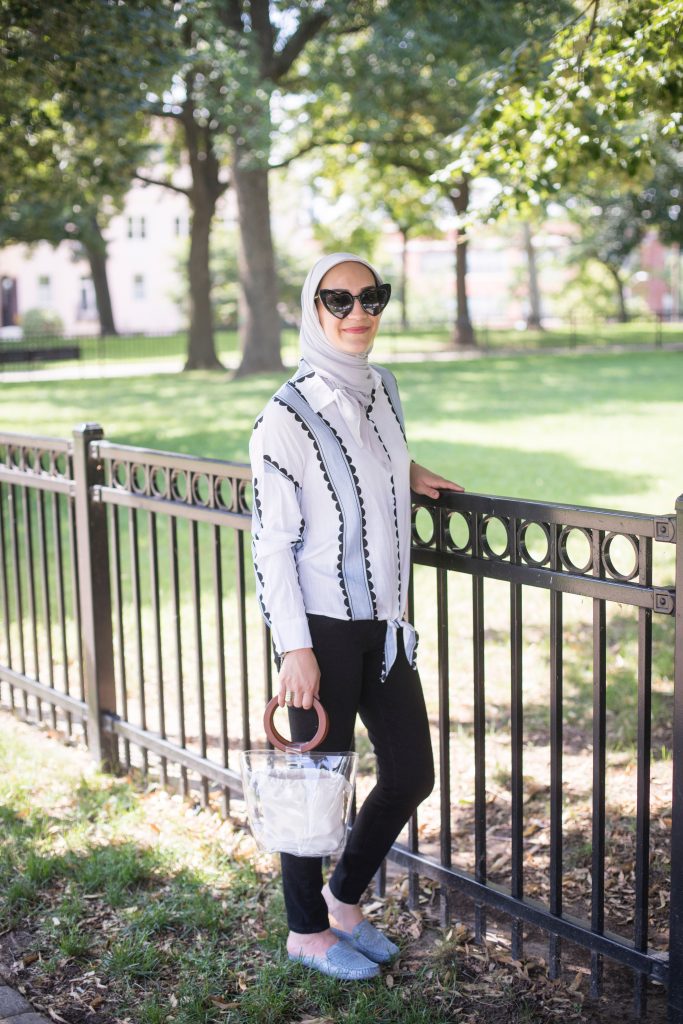 I have finally jumped on the knotted shirt bandwagon! I’m loving this lightweight patterned top which makes a great fall transitional piece. For this look I style the top with my favorite pair of black denim, matching blue mules, and clear bucket bag. I recently styled the top with a duster vest and black booties for a layered fall look – it’s such a versatile top!! I also have to sure these heart sunnies which are a great dupe to the $450 YSL sunnies! This pair is only $10 from Amazon and comes in a variety of colors!! I’ve already ordered the black, red, and pink pairs. I’m currently eyeing the Tortoise pair for fall!