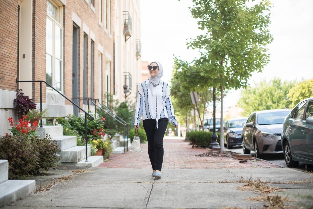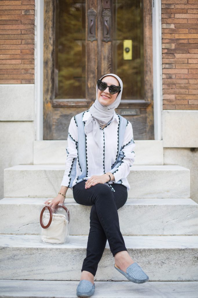 Top: Shein c/o | Denim: Banana Republic | Scarf: Haute Hijab | Mules: M. Gemi | Bag: Shein c/o | Sunglasses: Amazon (only $10!!!) | Lipstick: MAC Please Me