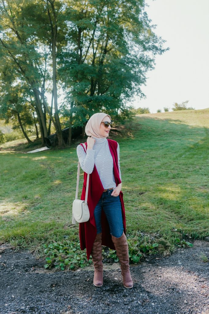Vest: SheIn c/o | Top: Banana Republic | Denim: Banana Republic | Scarf: Haute Hijab | Belt: J. Crew | Bag: GiGi NY | Boots: DSW (old, similar) | Ring: Kendra Scott c/o | Lipstick: NARS Audrey