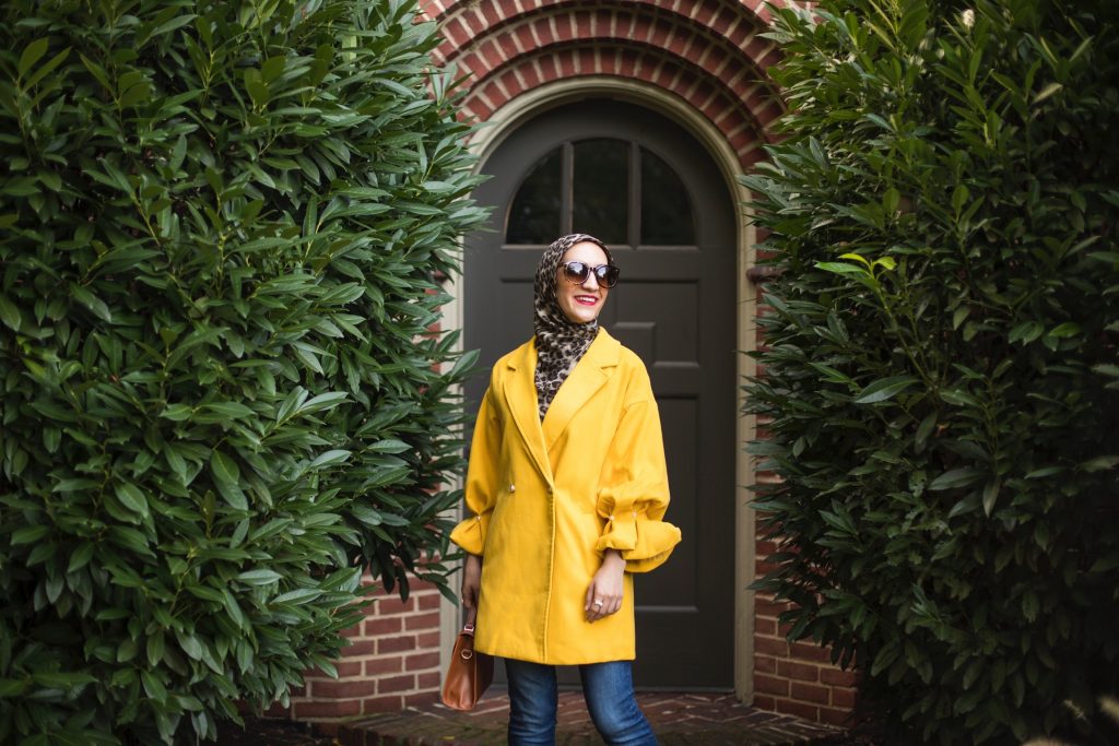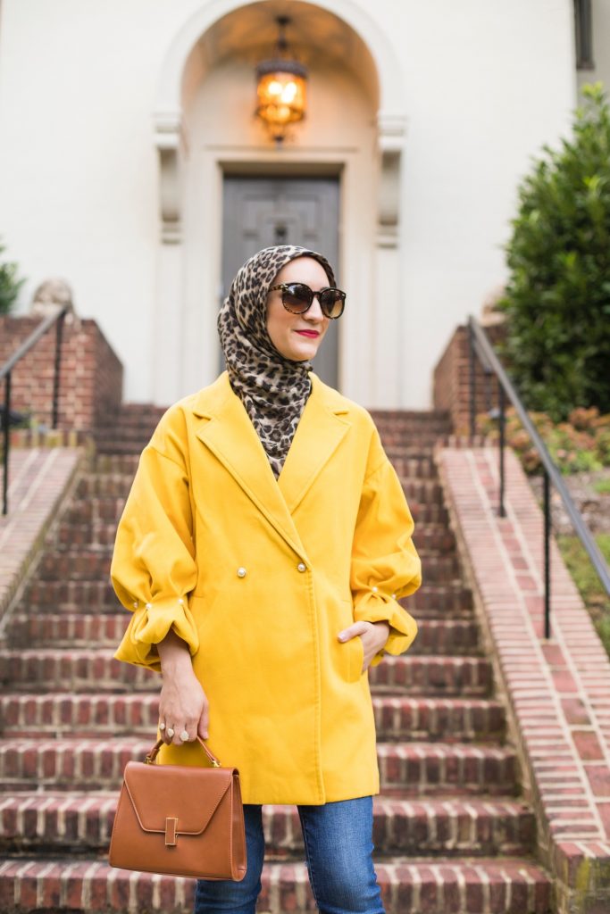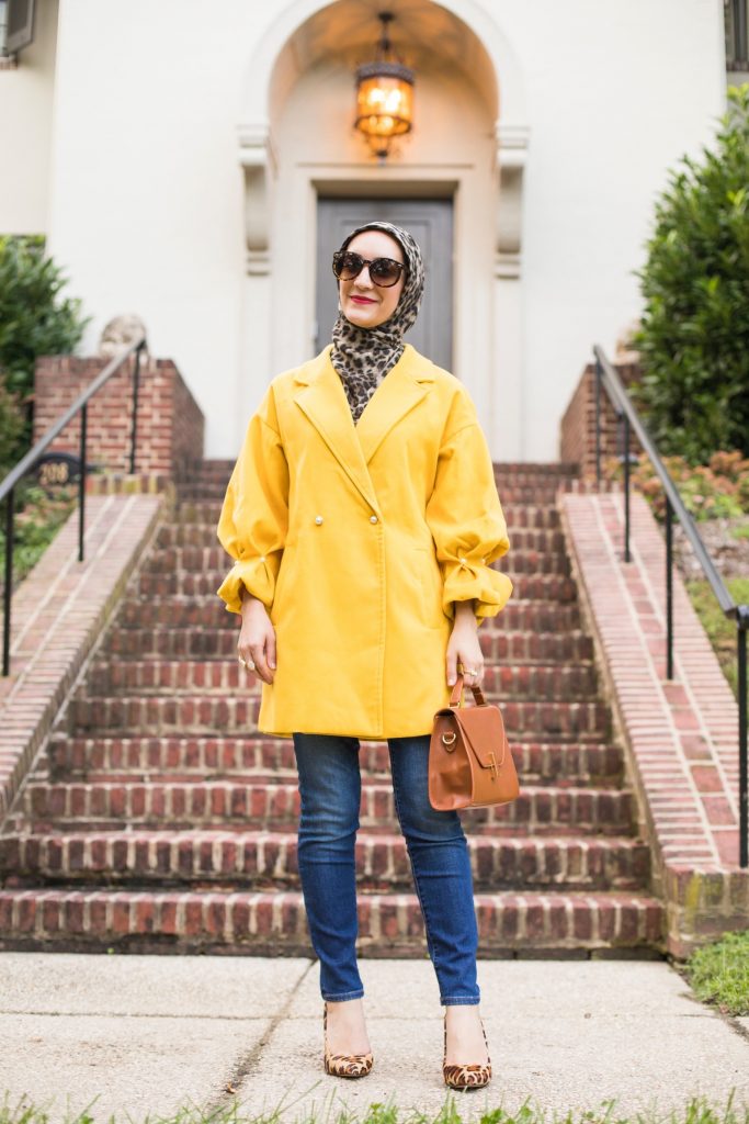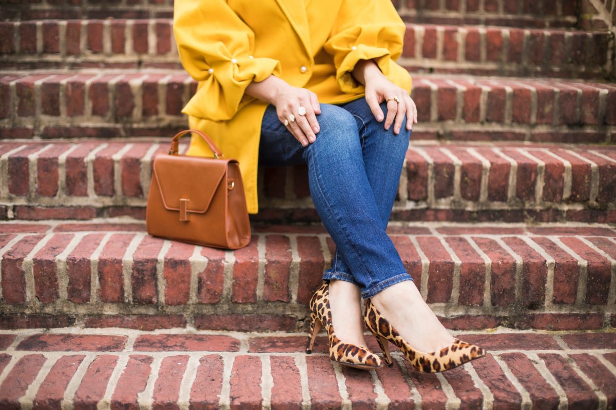 I have a slight coat obsession! I love colorful, detailed, and unique coats. I have one black coat that is tucked in the back of my closet that I rarely wear, but keep it because every girl needs a black winter coat. When I saw this yellow number on SHEIN I was instantly in love. The feminine pearl sleeve details and ruffle style is very unique and the $31 price tag is a bargain! For sizing reference, I ordered a Small. The coat is not super heavy and makes a great piece for layering. I paired my coat with a leopard scarf and my favorite leopard heels for a timeless fall look.