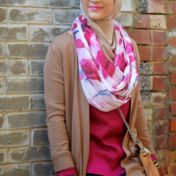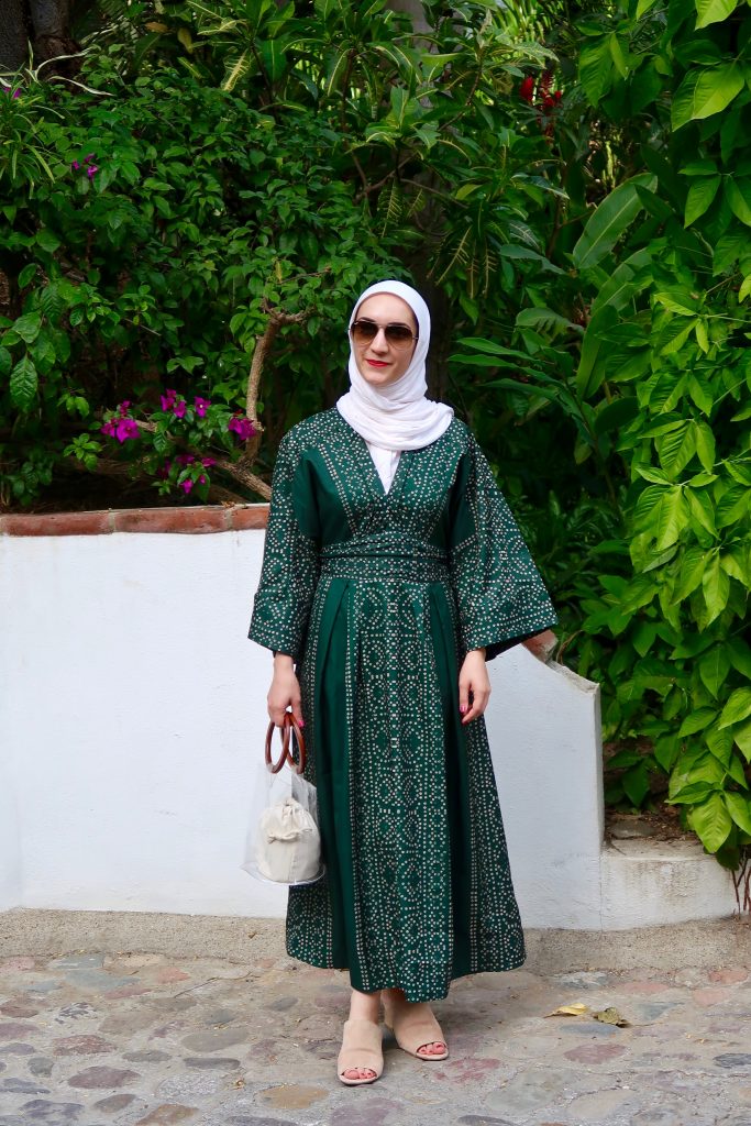 The dress is very comfortable and forgiving. The sleeves are a very wide and definitely a true kimono style. The dress has a full skirt and does have a lot of fabric to it. I personally didn’t like the tassels on the neckline therefore I cut them off. The dress has a deep V neckline therefore I wore a nude tank underneath for coverage and tucked my scarf in for added coverage. I paired the dress with a neutral scarf, bag, and heels to really keep the attention on the dress.