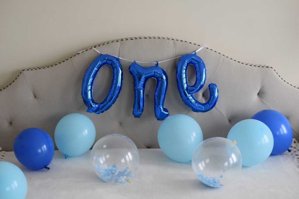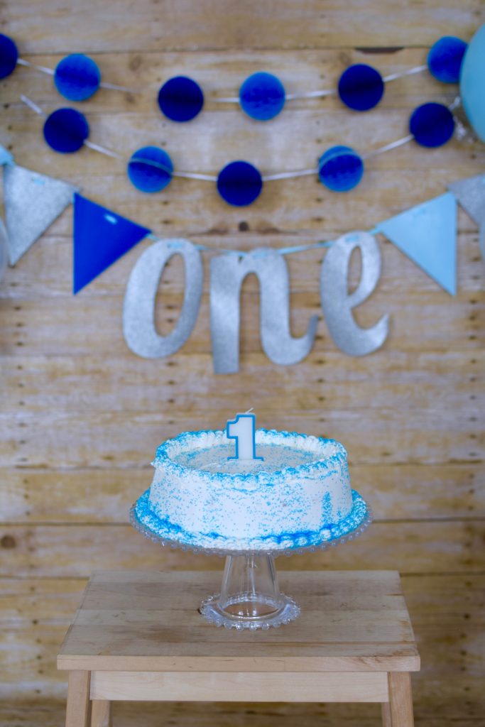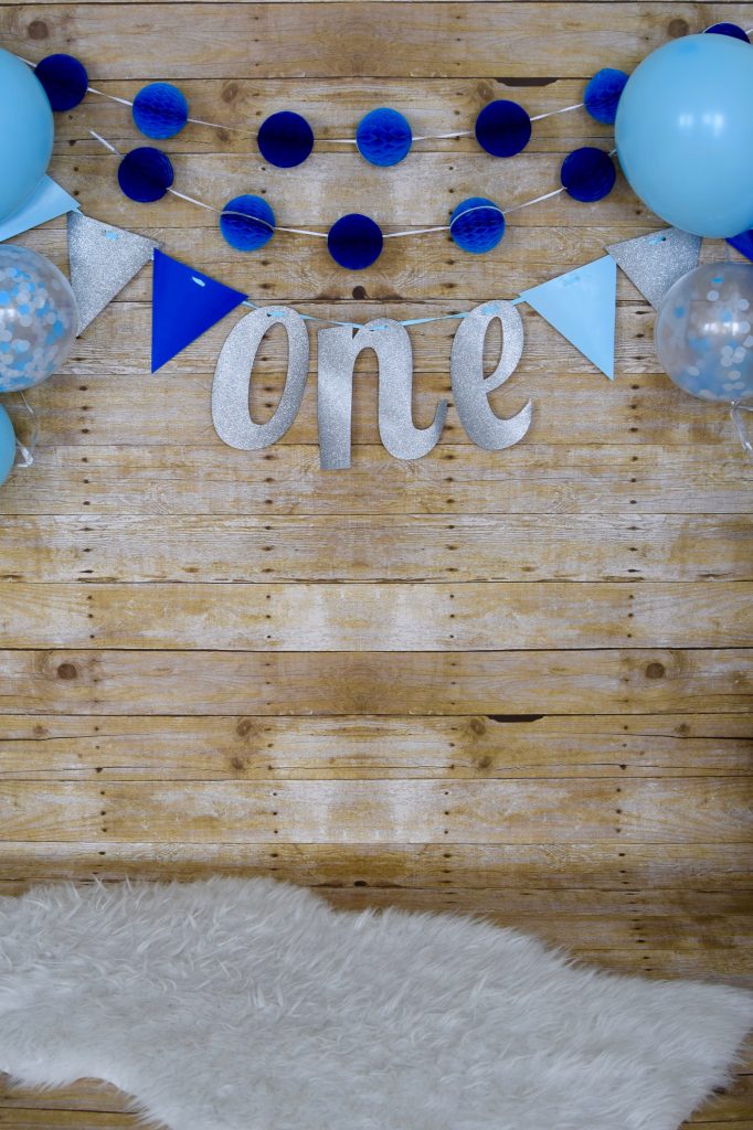 For the photo backdrop I purchased a roll of Fadeless Paper in Weathered Wood from Michaels. At first I wanted to get a white backdrop. I drove out to 3 different Michaels and they all happened to be sold out, therefore I decided to go with a wood backdrop, and I actually loved how all the photos turn out! I set up two areas for photos – the first set of photos were pre-cake on a white blanket with a one balloon hanging and a bunch of balloons blown up. The second backdrop was where the cake smash happened. The cake is messy, therefore I made sure to put a plastic tablecloth down under the contact paper to avoid any cake getting on the carpet. I used clear packaging tape to hold the contact paper up on the wall. I decorated the area with banners and balloons in the blue theme and did a few test shots to make sure everything was in the frame.