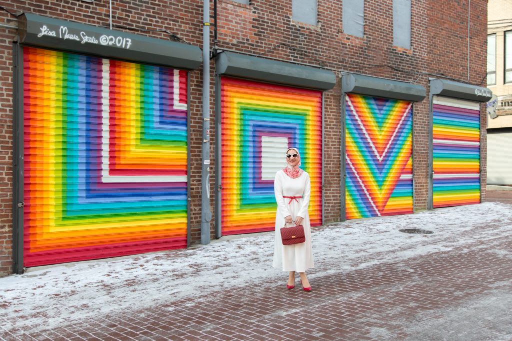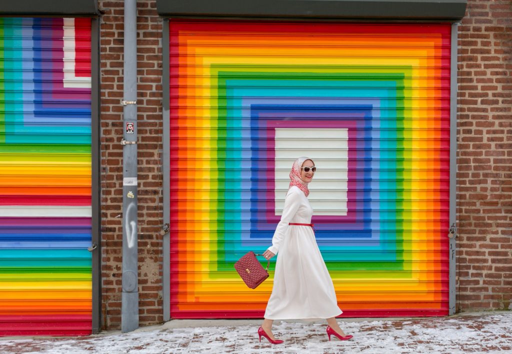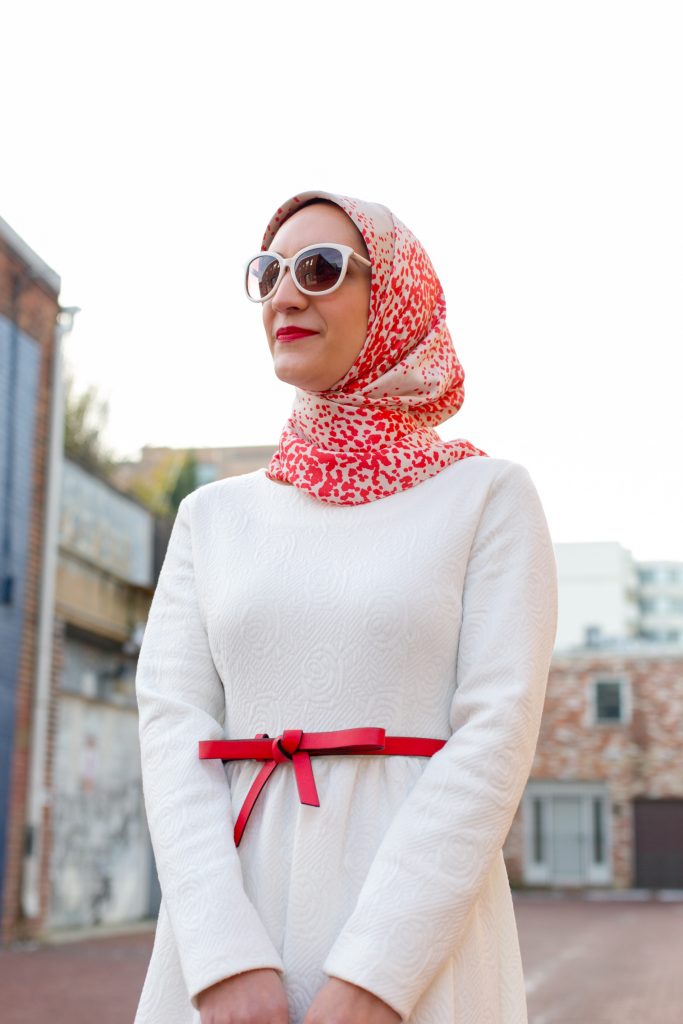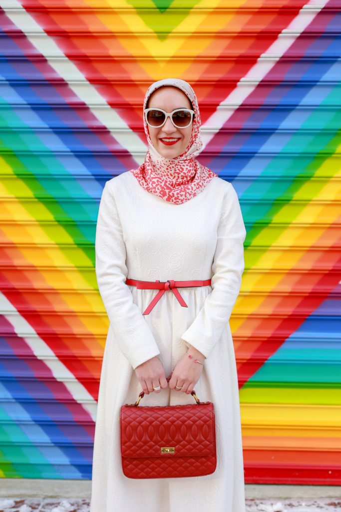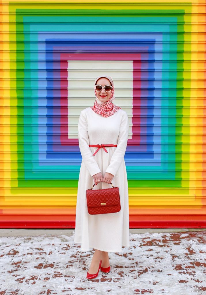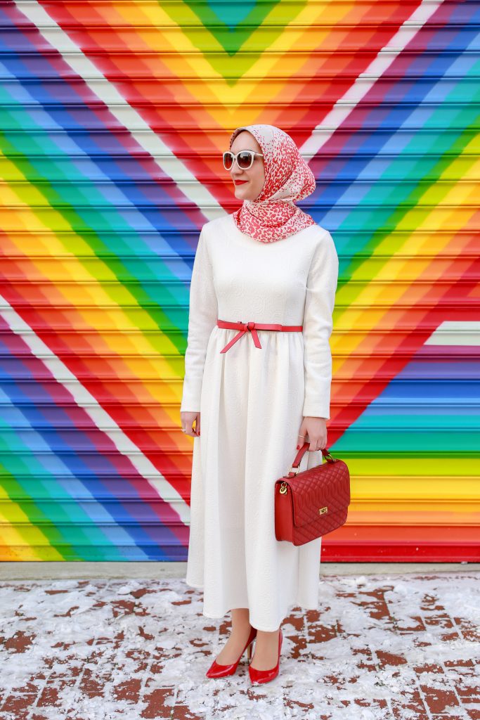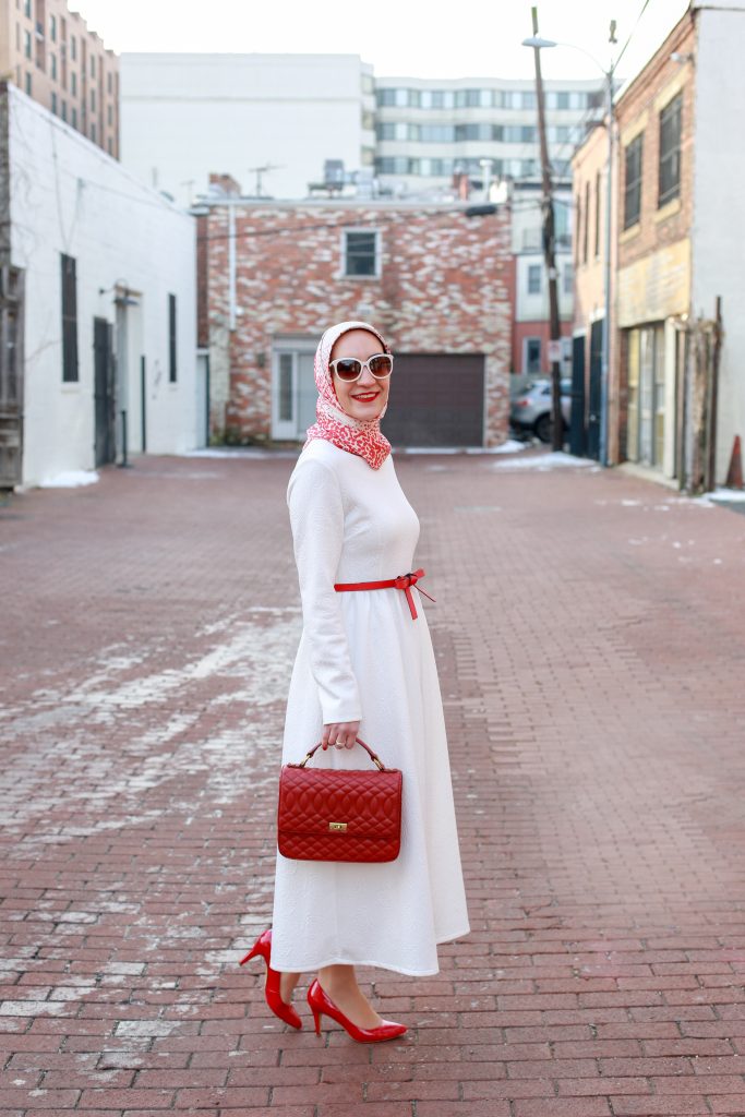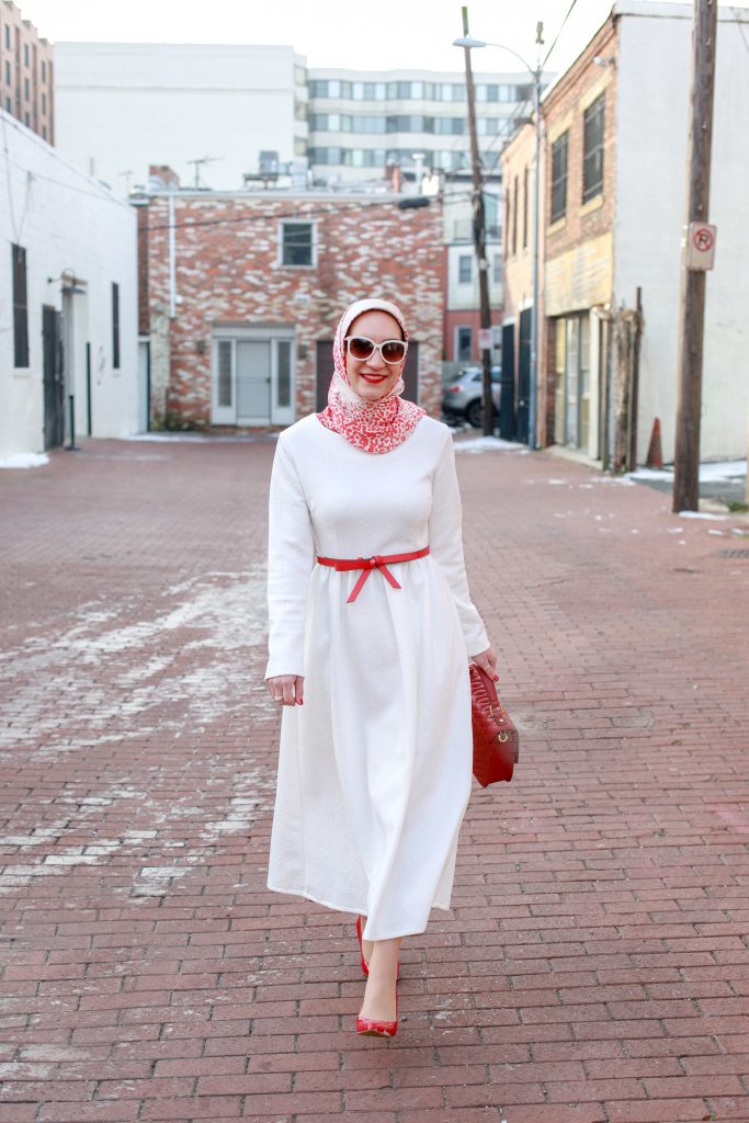 Valentine’s Day is just around the corner and I’ve been in the mood to wear lots of red and pink looks. Since I’m trying to buy less clothes, I decided to shop my own closet and re-style one of my favorite white midi dresses. I’ve had this midi dress in my closet for over two years, last seen here on the blog. I love that the dress is long-sleeved and midi length because it is very hard to find modest long-sleeved midi dresses!