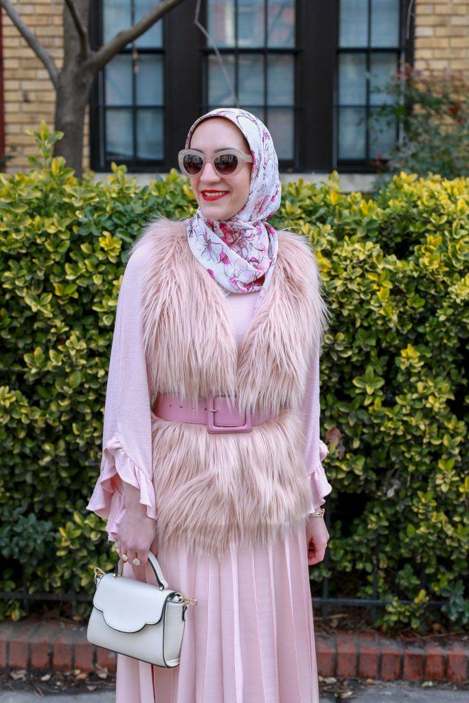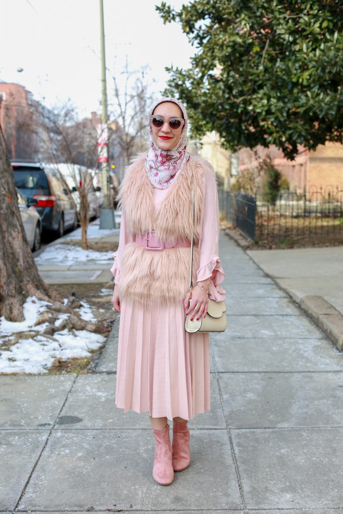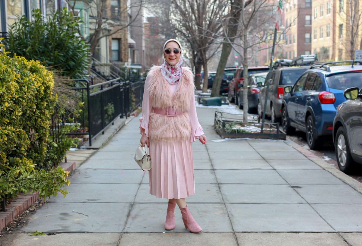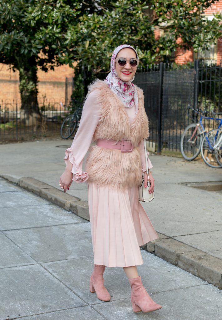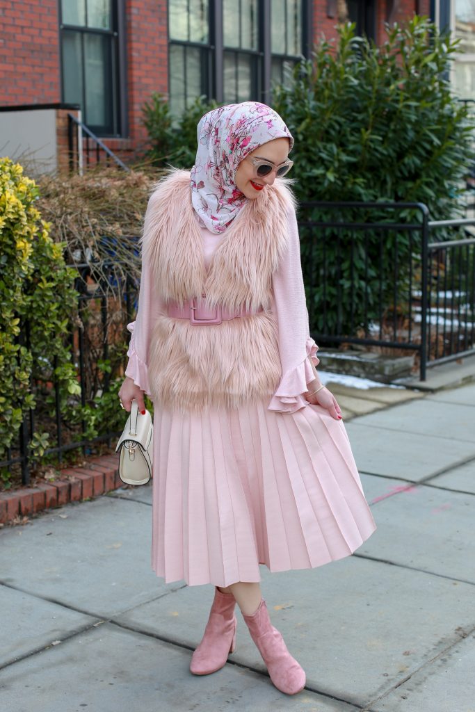 In this episode of shopping my own closet, I wanted to style a feminine V Day look with this pretty pink vest that has been in my closet for two years. I previously styled the vest, here, with a pink top and black trousers. This time around I went for a monochromatic pink look! I paired the vest with a pleated midi skirt, last seen here, and a pink ruffle sleeved top. I love all the texture and dimension of this look and how ultra feminine it is. The pink suede boots, which are back in stock and less than $20, complete the outfit!