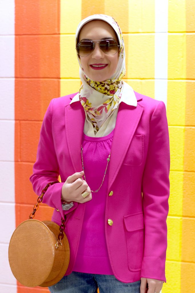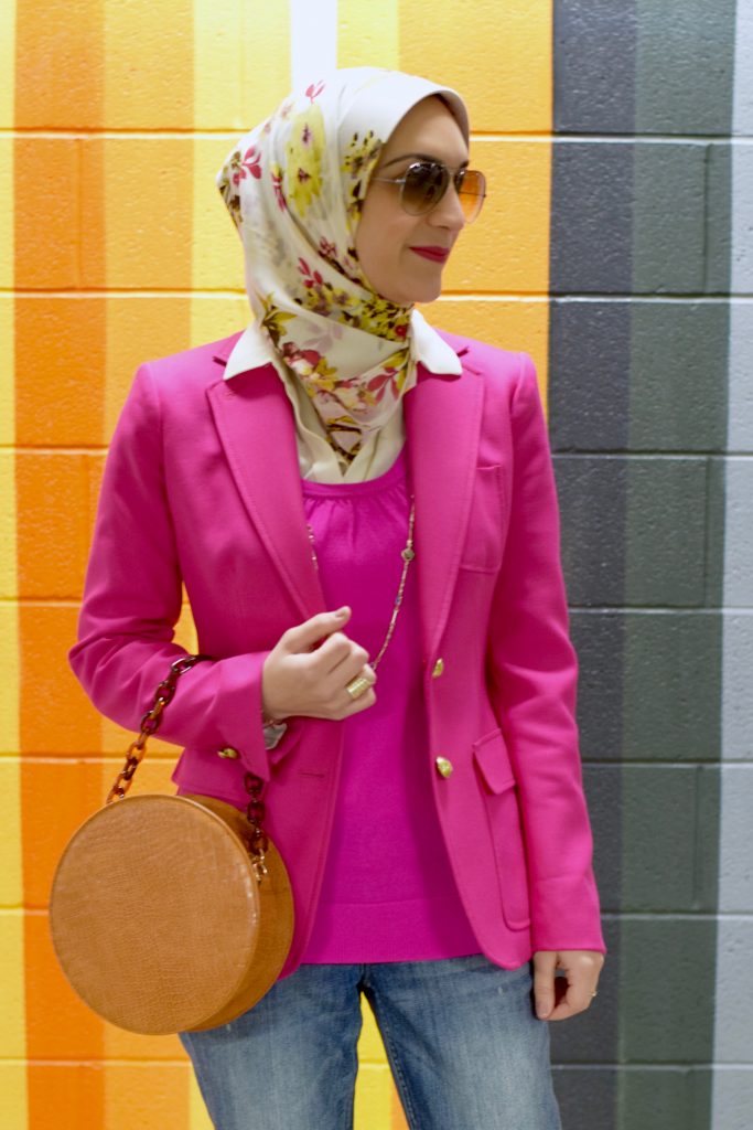 Blazer: J. Crew (old, similar) | Sweater: J. Crew | Denim: Banana Republic | Scarf: Haute Hijab | Heels: Nordstrom (old, similar) | Bag: SHEIN c/o | Sunnies: Ray-Ban | Necklace: Kendra Scott c/o | Lipstick: MAC To Matte With Love