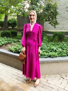 I love a good long sleeved midi dress. The color and subtle pattern on this dress is amazing. The only issue I had with it was that the skirt portion of the dress is wrap-around therefore it occasionally would fly open when walking. I had to pin it with a small safety pin since it was a bit windy the day I wore it. Otherwise I loved the print, fit, and color.