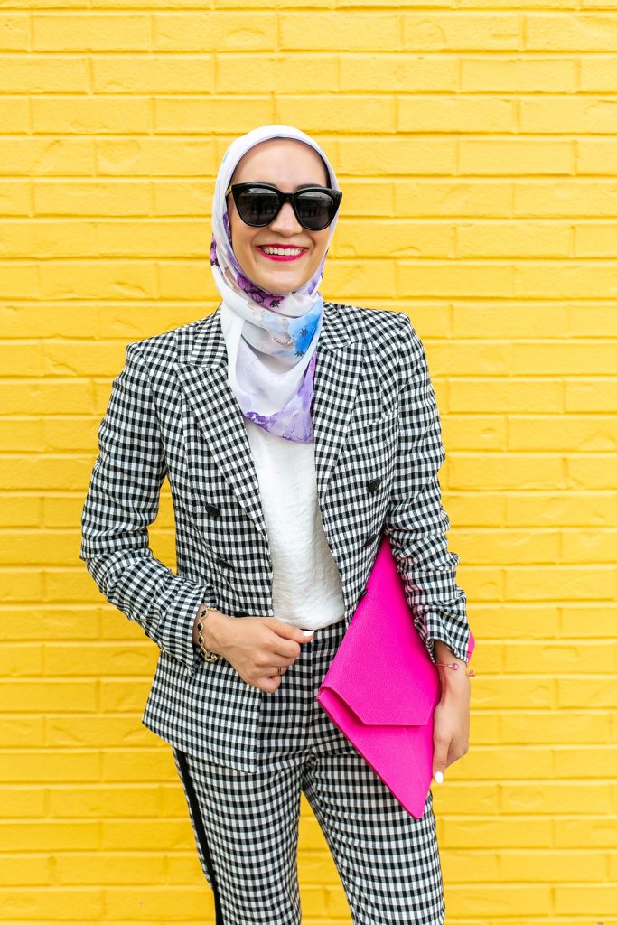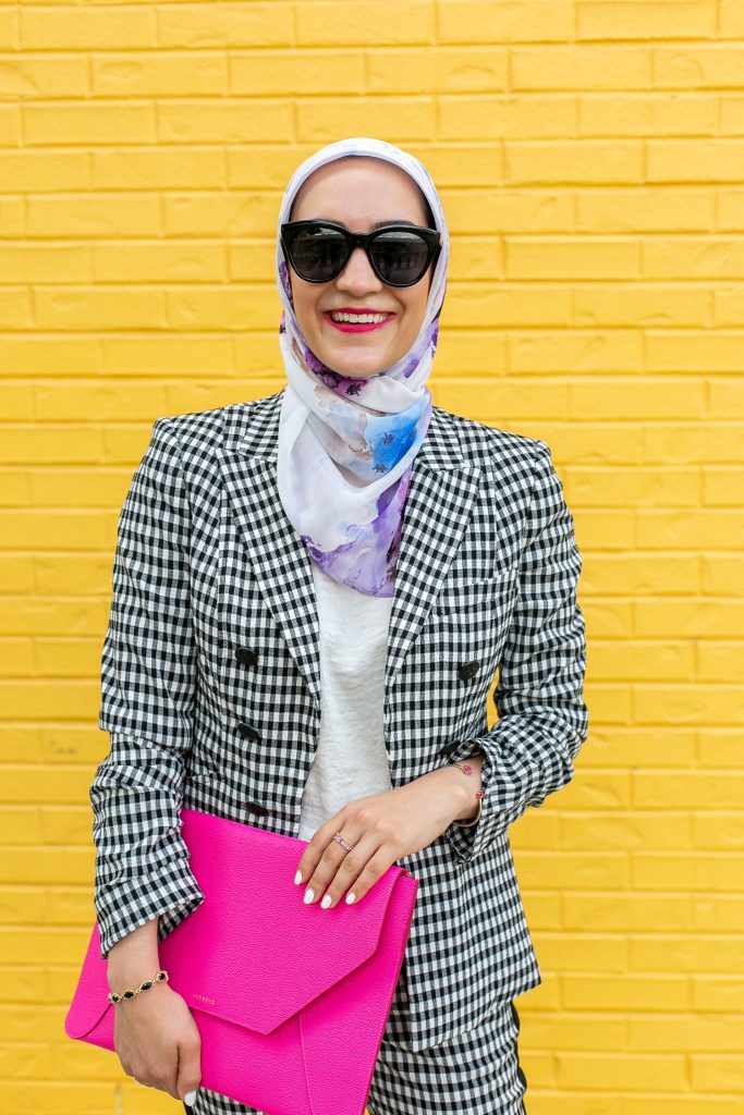 Blazer: Veronica Beard via Rent The Runway | Pants: Veronica Beard via Rent The Runway | Top: Banana Republic | Clutch: Senreve | Heels: M. Gemi | Scarf: Haute Hijab | Sunnies: Nordstrom | Bracelet: Kendra Scott | Lips: MAC To Matte With Love
