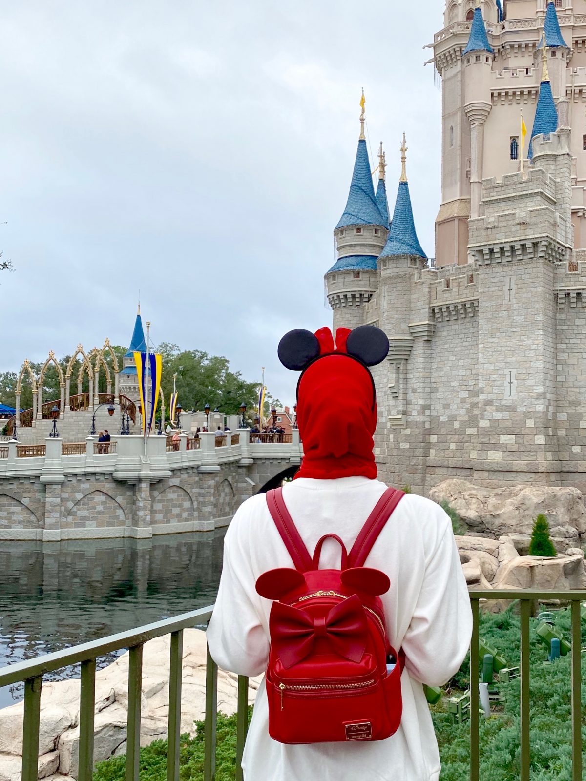 We were able to visit Magic Kingdom and Animal Kingdom during our trip. On the day we were at Magic Kingdom it was a bit overcast and misty, therefore I had to scratch the dress I packed and opt for jeans and comfy sweatshirt to be practical. I busted out all my favorite red accessories, this adorable Minnie Style Backpack and Minnie Ears, for the day.