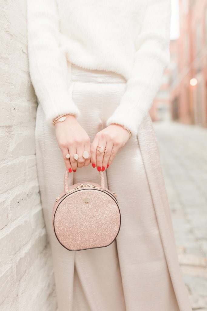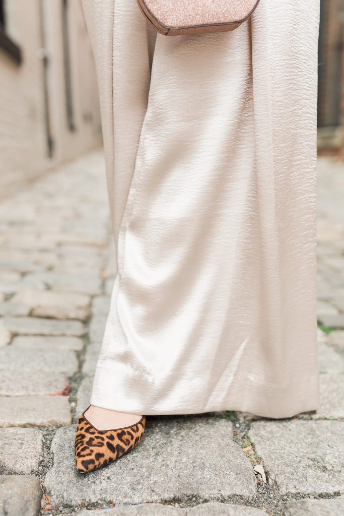 These pants give me all the Great Gatsby vibes! For a daytime glam look I paired the satin pants with a cozy textured white crop sweater and pops of leopard. I absolutely love how this outfit can easily transition from desk to dinner to no time. I’m happy to announce that I have officially embraced the satin fashion trend and I’m currently on the hunt for the perfect stain skirt!