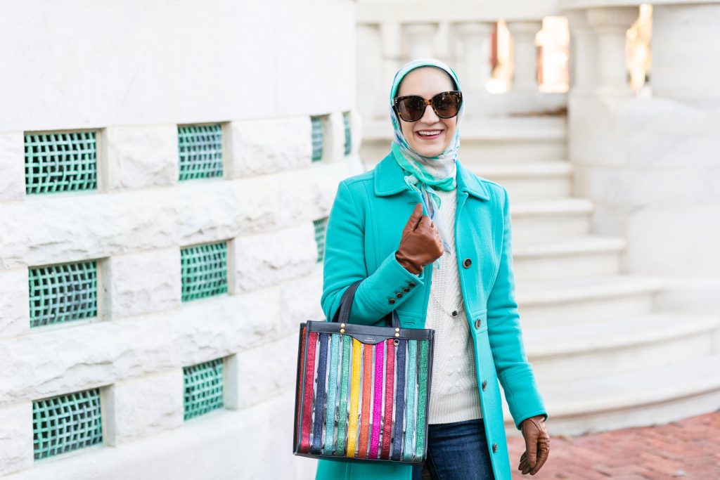 Coat: J. Crew | Sweater: Banana Republic | Denim: Banana Republic | Boots: Nordstrom | Scarf: Haute Hijab | Bag: Rent The Runway | Sunnies: Nordstrom | Necklace: c/o Kendra Scott | Gloves: J. Crew