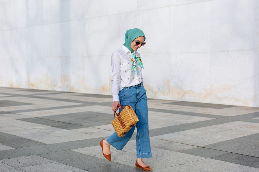 Top: J.Crew (old, similar) | Denim: Everlane | Scarf: Haute Hijab | Bag: Free People (old, similar) | Flats: Sarah Flint | Sunnies: Anthropologie