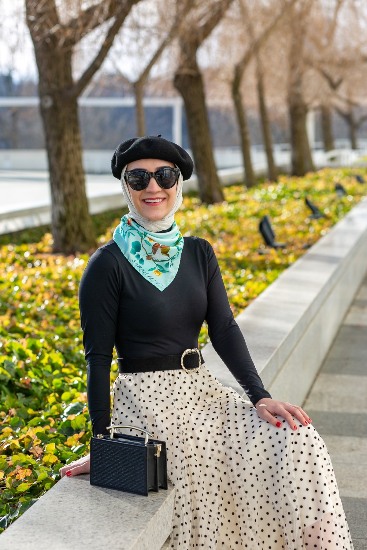 Bodysuit: SPANX c/o | Skirt: Chicwish c/o | Scarf: Haute Hijab | Beret: Brixton | Belt: Sezane | Sandals: Sarah Flint c/o | Sunnies: Nordstrom