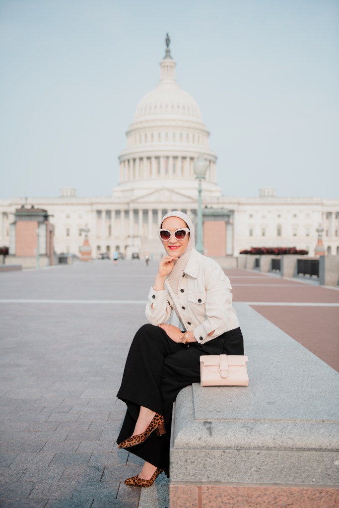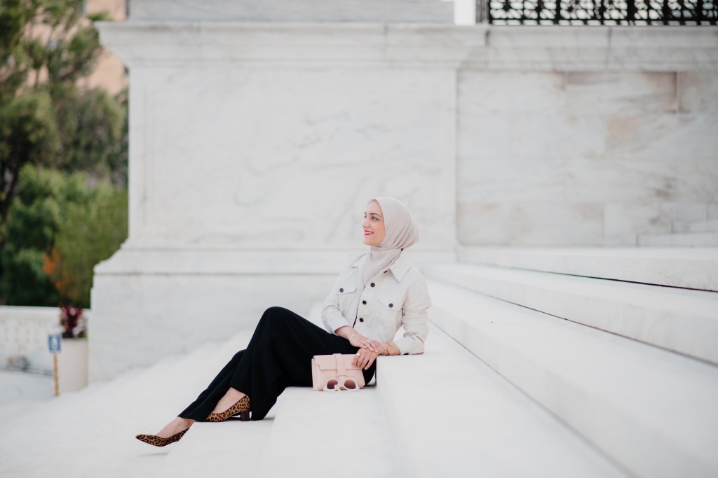 M.M.LaFleur Demi Jumpsuit | M.M.LaFleur Anna Jacket | Haute Hijab Chiffon Scarf | Sarah Flint Emma Pumps | Senreve Aria Bag | Lele Sadoughi Sunglasses