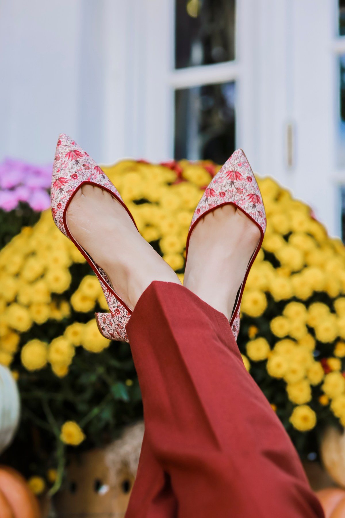 Sarah Flint recently launched a limited edition of my favorite shoe style, the Perfect Emma, in a beautiful Mademoiselle Cerise Fabric. The print comes in three different styles: Perfect Emma, Perfect Jay Pump, and Natalie Flats. The Mademoiselle Cerise prints can be styled for everything from picking pumpkins to a night out on the town.