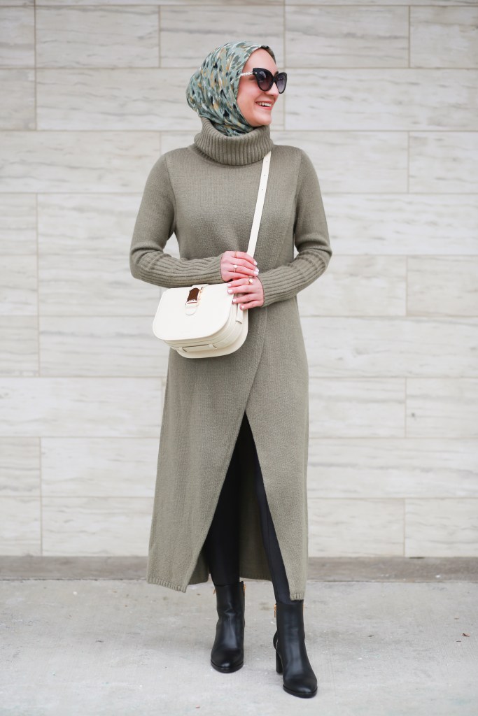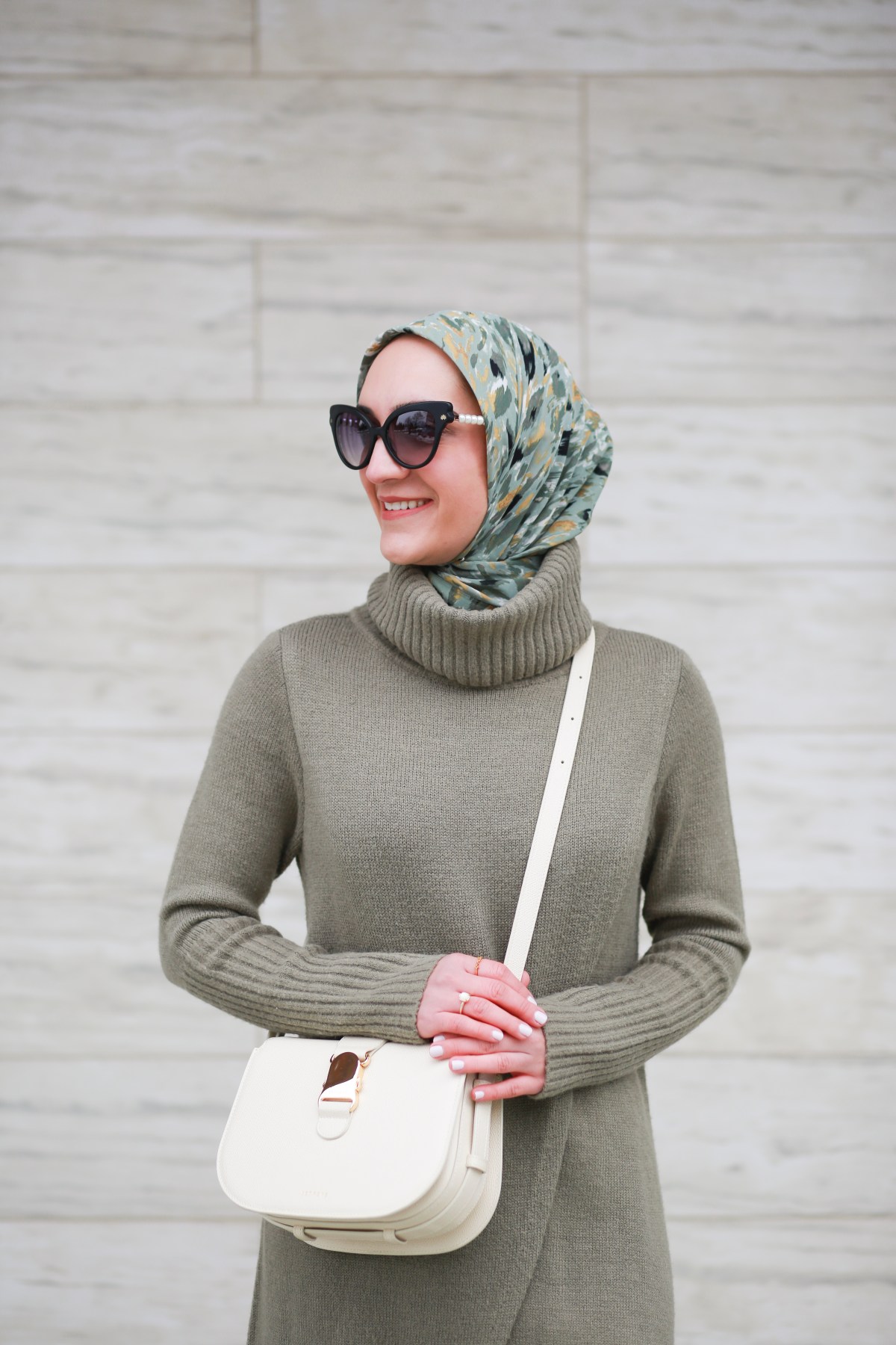 Sweater Dress | SPANX Leggings | Haute Hijab Scarf | Lele Sadoughi Sunglasses | Sarah Flint Booties | Senreve Cadence Bag c/o