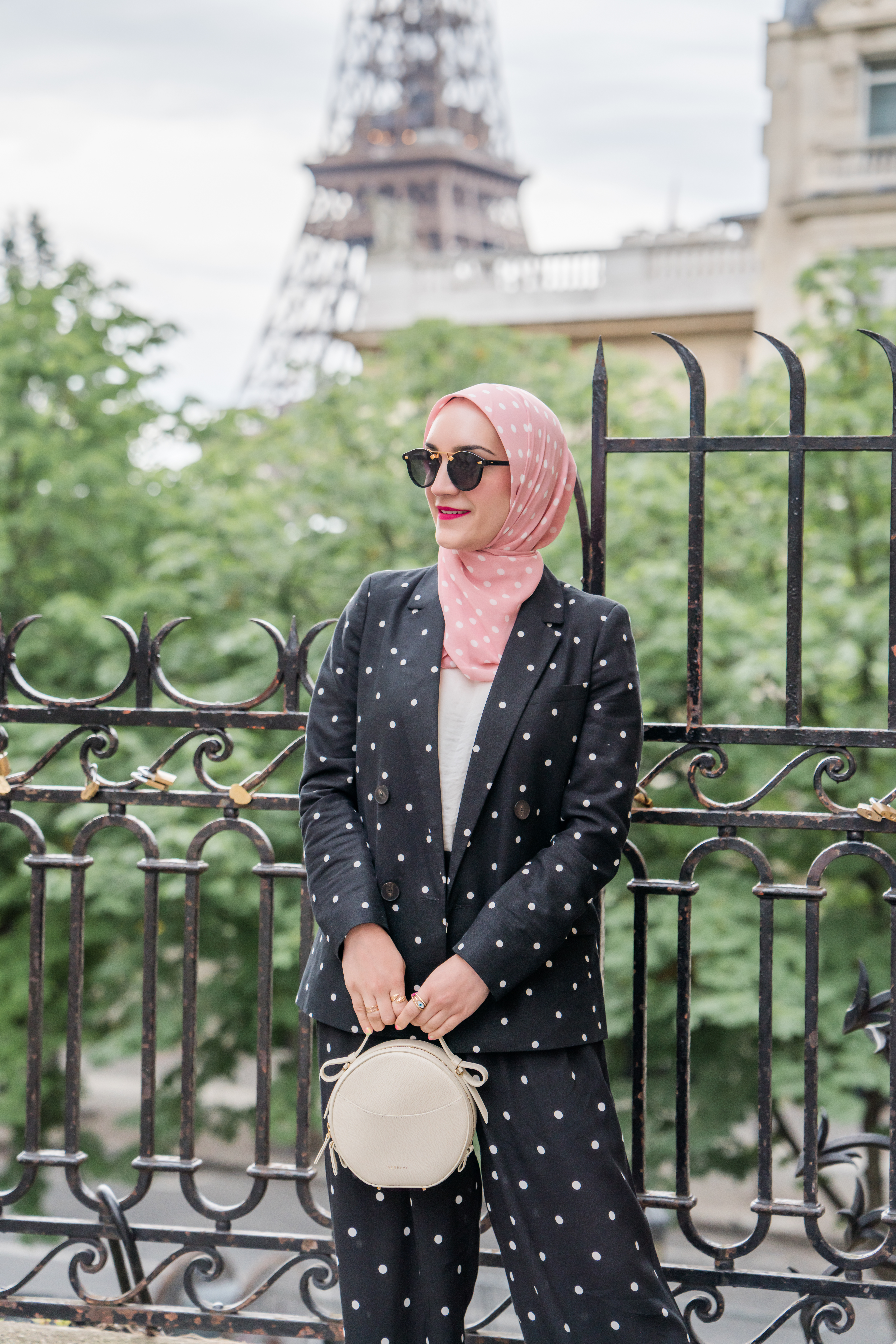 Blazer and Pants: Sezane | Top: MMLaFleur | Bag: Senreve | Heels: Sezane | Scarf: Haute Hijab | Sunglasses: Krewe