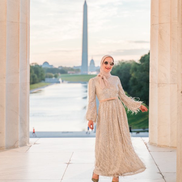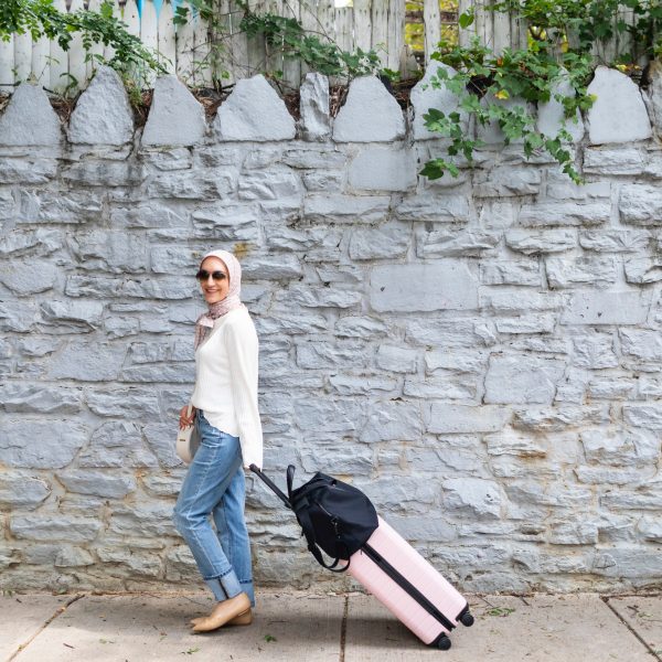 Sezane Agnes Jacket | MMLaFleur Annika Tee | Haute Hijab Chiffon Scarf | Sezane Martin Crop Trousers | Sezane Paula Babies | Loewe Brooch | Krewe Crystal Mirrored Sunglasses | Senreve Circa Bag
