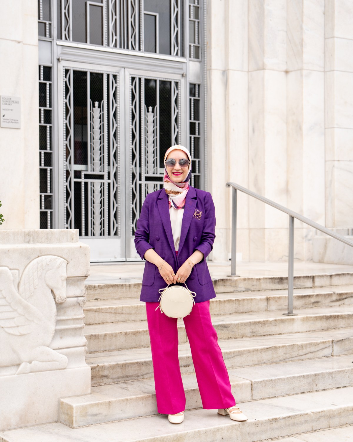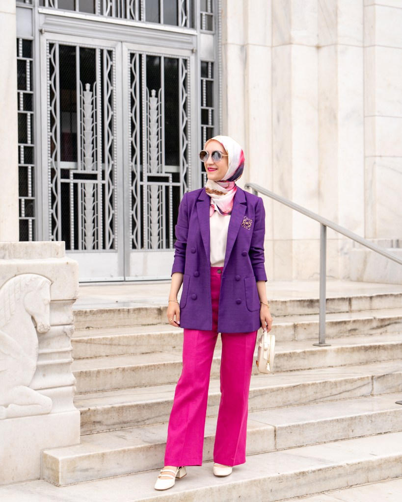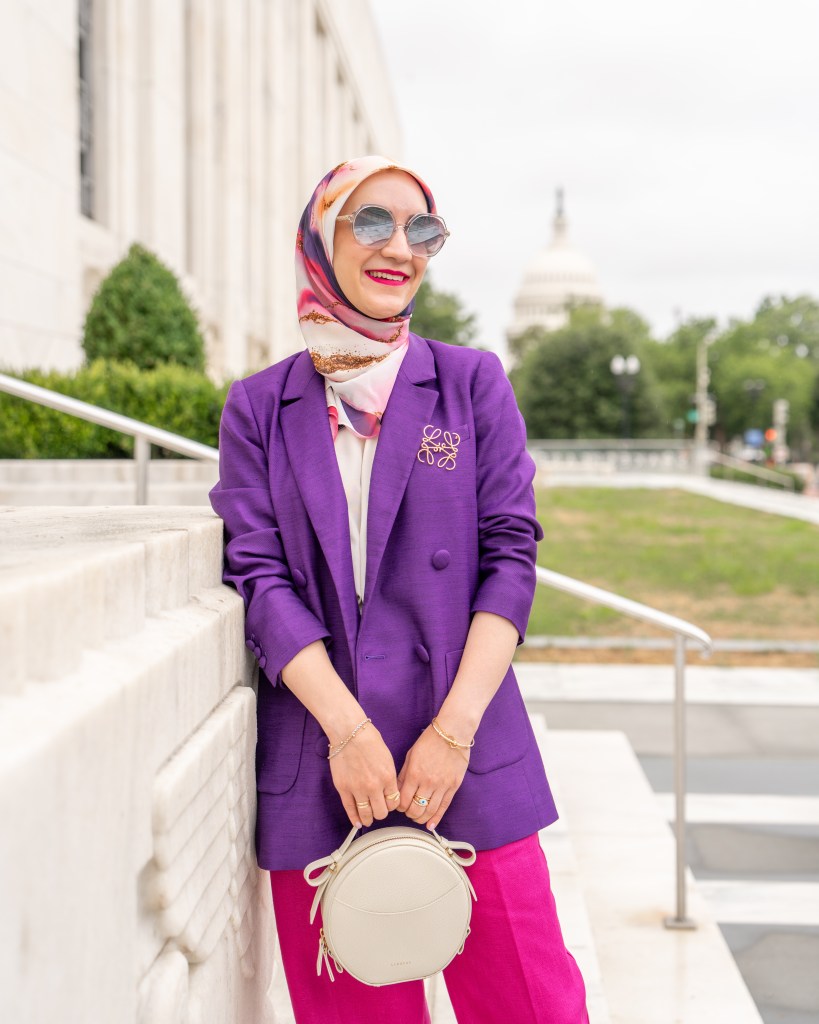 Color blocking is a fun and stylish way to play with your wardrobe, and the combination of purple and fuchsia here is both daring and harmonious. Mixing bold colors can be intimidating, but finding hues that complement each other creates a balanced and eye-catching look. The statement Loewe brooch adds a touch of elegance and personality, proving that investing in unique accessories can elevate any outfit.