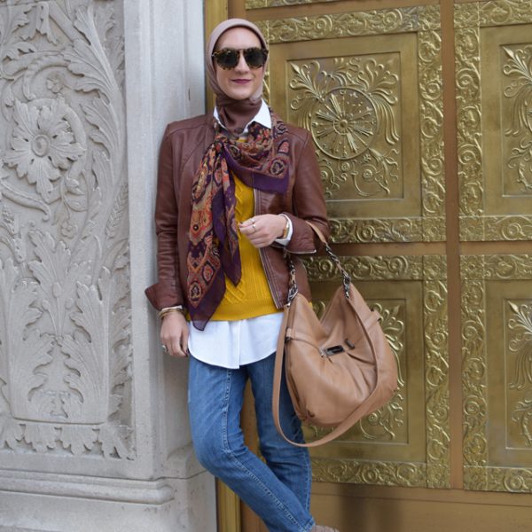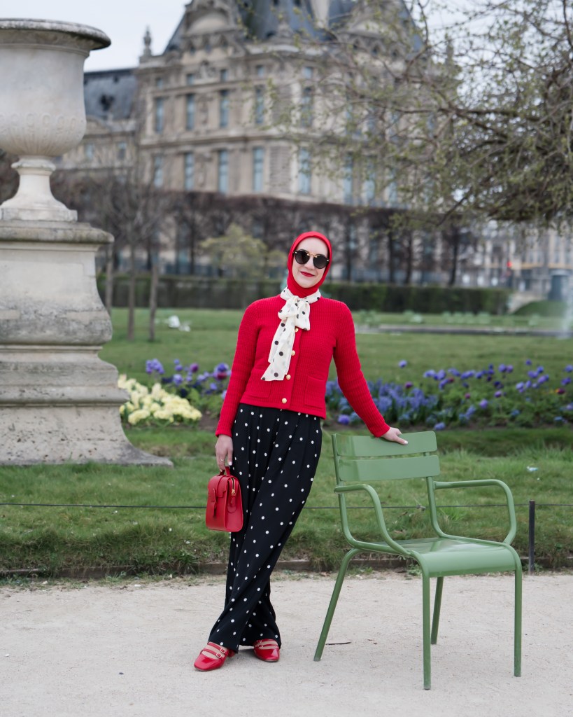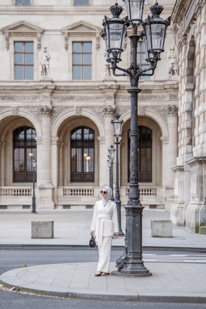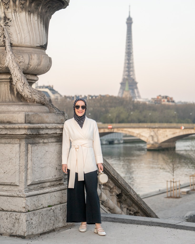 Look 8: Scarf: Haute Hijab | Set: Sezane, Jacket and Pants | Shoes: Sezane | Bag: Fleuron | Sunnies: Jimmy Fairly
