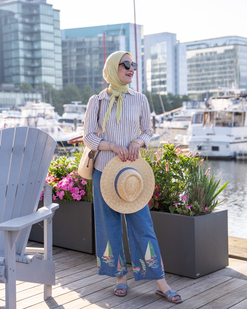 This nautical-inspired summer outfit has all the ingredients: lightweight fabrics, a playful maritime print, and timeless blue-and-white tones that scream “seaside vacation.” I styled this look for a day at The Wharf in Washington, D.C.—no sailing required.