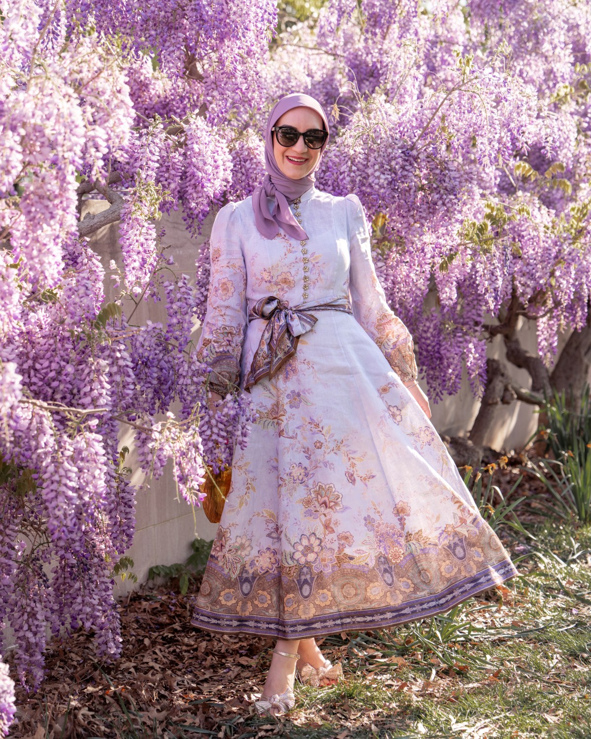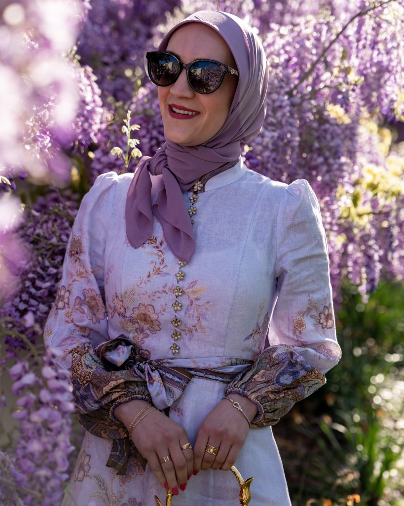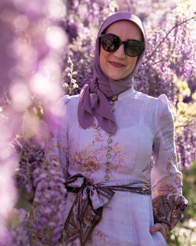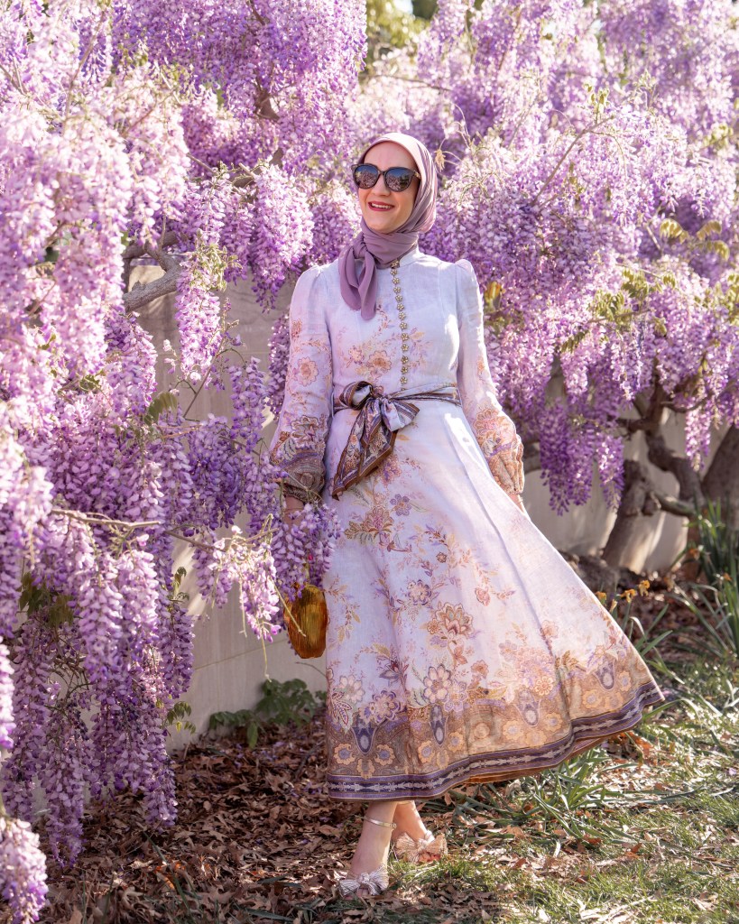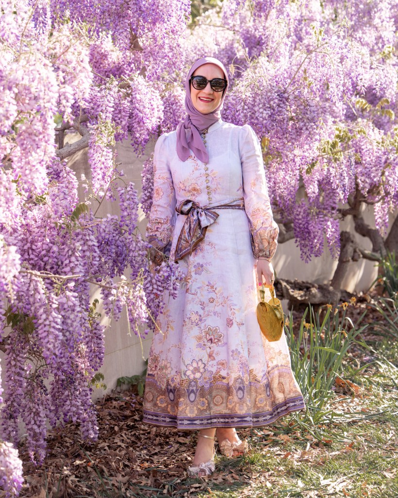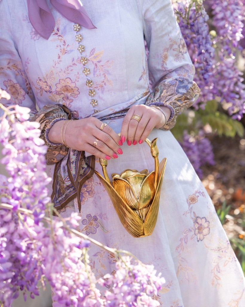 Spring in DC never gets old, and wisteria season is one of those little windows where everything feels extra beautiful. Pair that with a statement dress, a meaningful accessory, and a little sunshine… and you have the perfect spring moment. Now excuse me while I go find the next set of blooms to match my outfit.